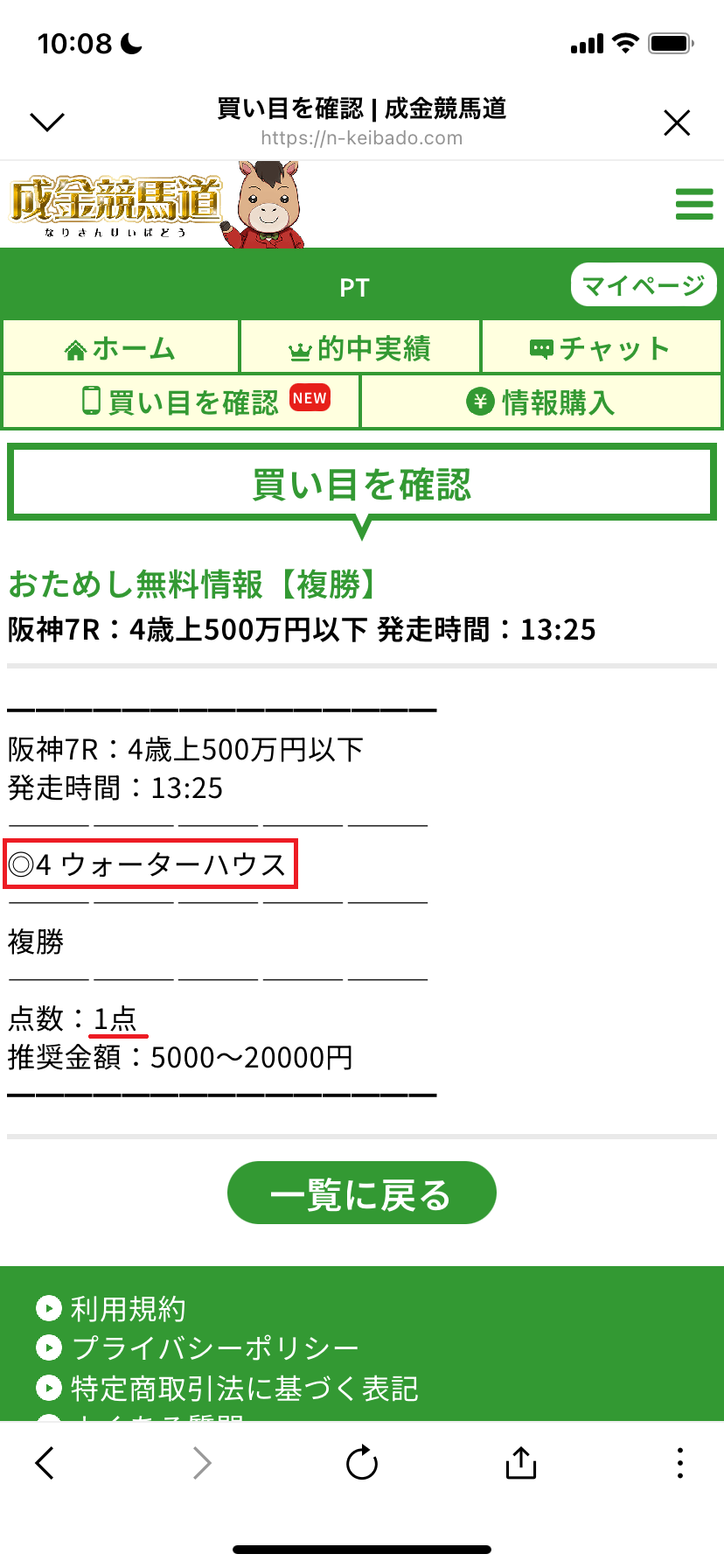 3月2日(土)阪神7Rで買い目点数1点的中!