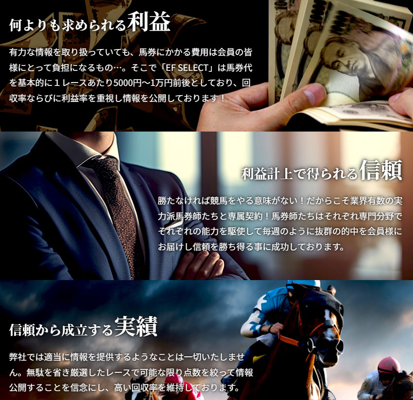 かなりの的中率と高額配当の万馬券を選び抜くセンスを感じ取れたので【EF-SELECT(エフセレクト)】は【優良】と判断させていただきます!