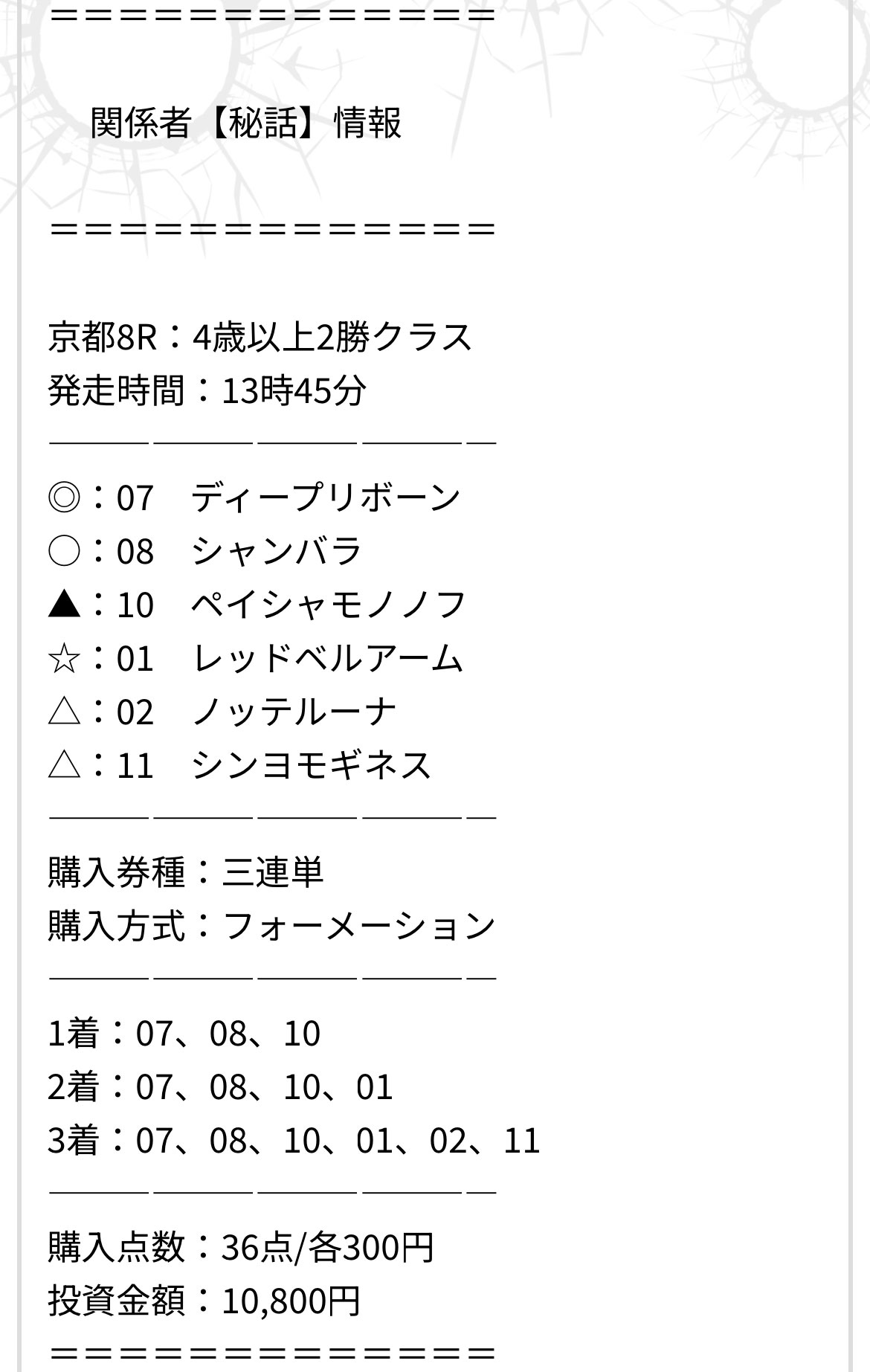 10-1-8で的中!!無料情報に続き有料情報も的中!!