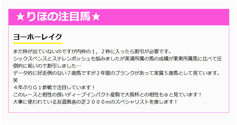 大阪杯(G1)で注目馬のヨーホーレイクが見事3着で馬券圏内だったようで喜んでいたので好調ですね。