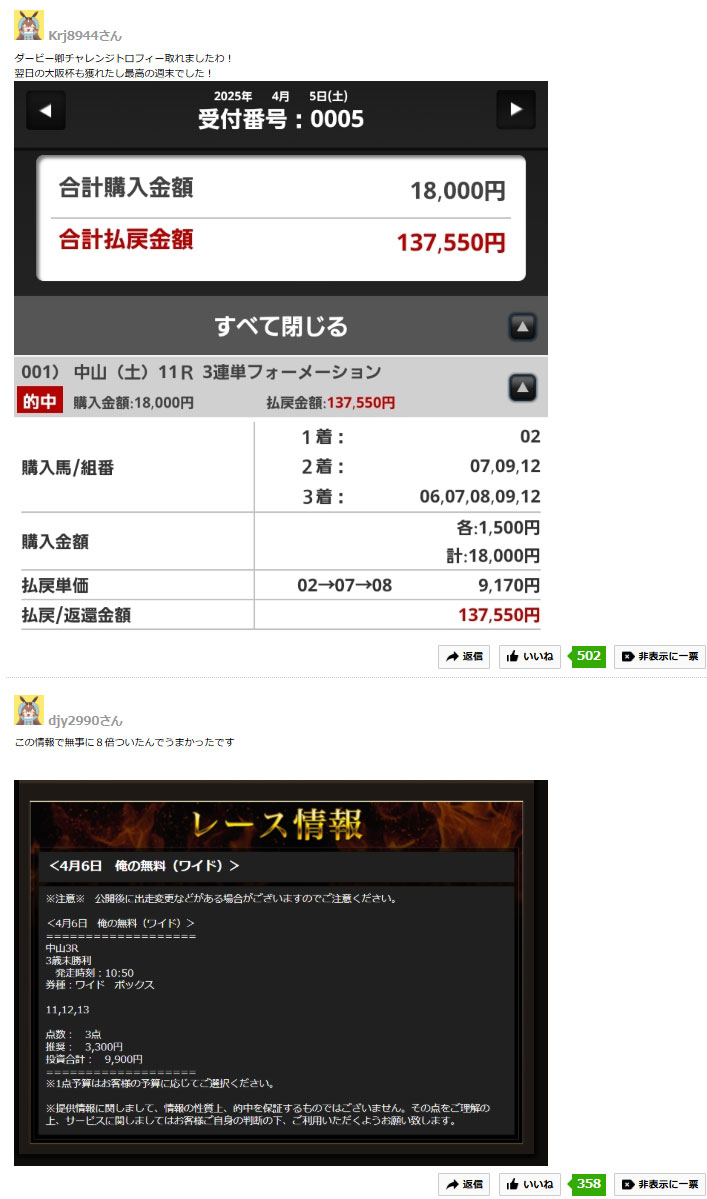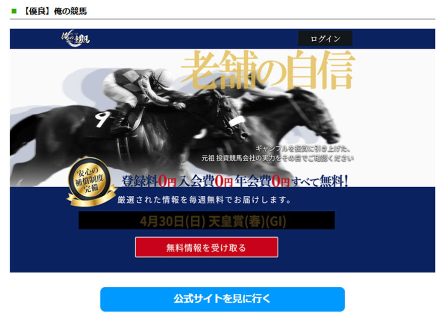 まだまだ4月もG1競争も始まったばかりですので攻略に向けてこちらから【俺の競馬】の的中を量産している口コミをご確認されて、ぜひ登録へ進んでください。