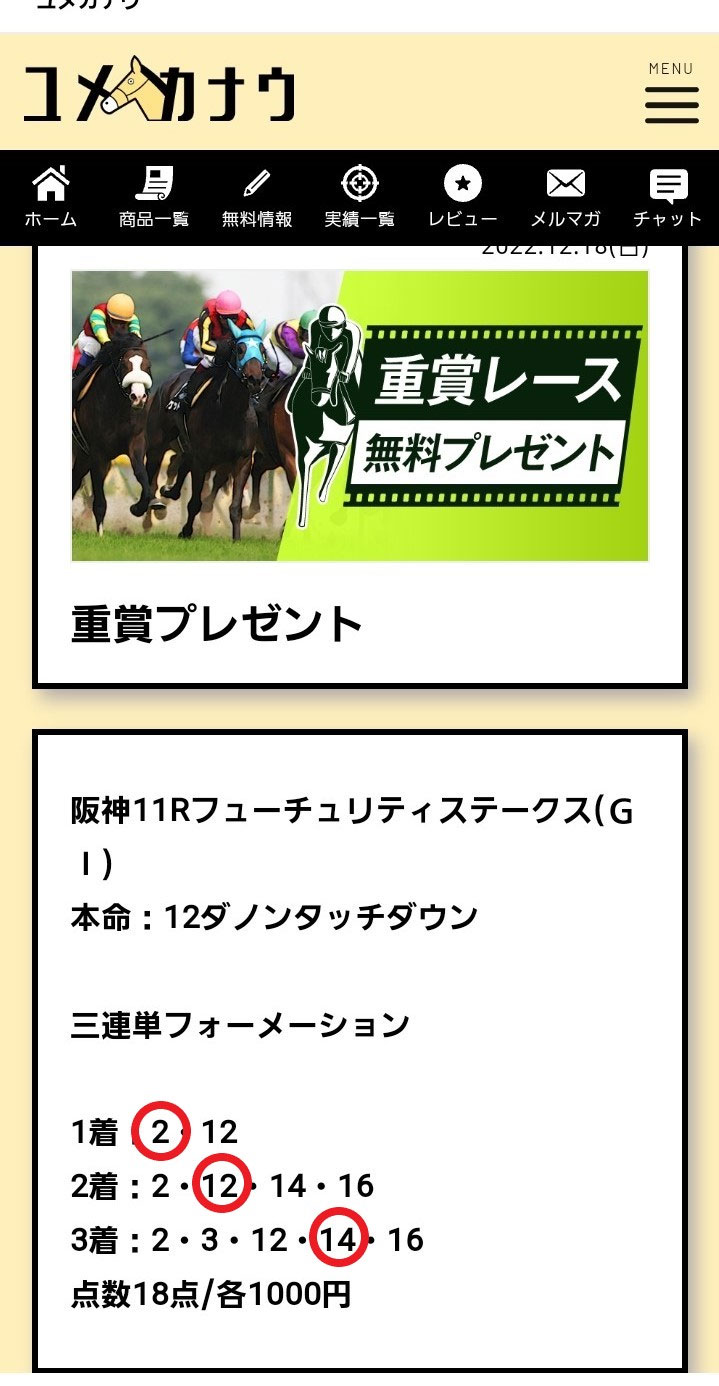 今回、抜き打ち自腹検証をした2サイトの買い目をまとめましたので、ぜひ12月の残りのレースに向けてのご参考にしてください。