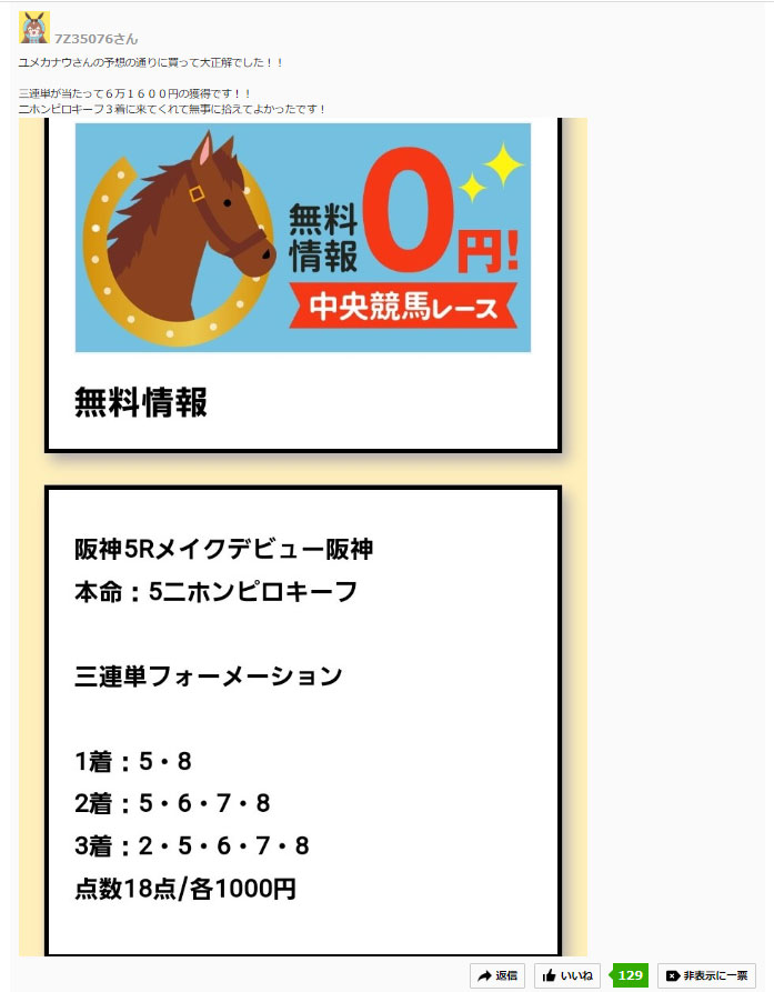 同じ日曜日に公開されていた無料情報でこちらの阪神の5レースも当ててたようです!