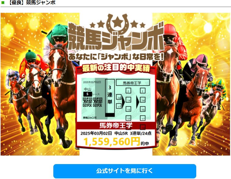 こんなにも重賞の的中期待が出来るサイトを発見できたので、まだご登録されていない方はぜひ【競馬ジャンボ】へのご登録をオススメしたいと思います!