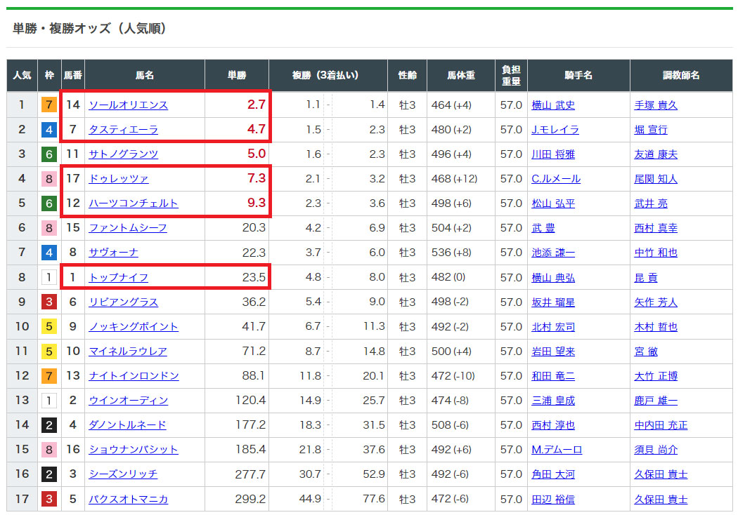 上位人気馬だけでなく中穴馬の8番人気①トップナイフも含まれた買い目になっています。