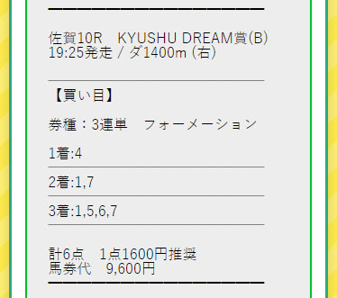 10/23(月)佐賀10R 3連単フォーメーション6点の予想。