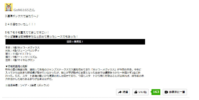 予想は本命から注目までの5頭が選ばれており、推奨券種はワイドと3連複のボックスとなっていました。