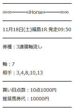 11月18日(土)福島1Rの三連複軸流し10点の予想