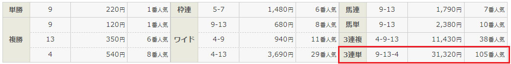3連単は1番人気⑨に6番人気⑬を1着・2着に固定した強気なフォーメーションで8点の買い目です。