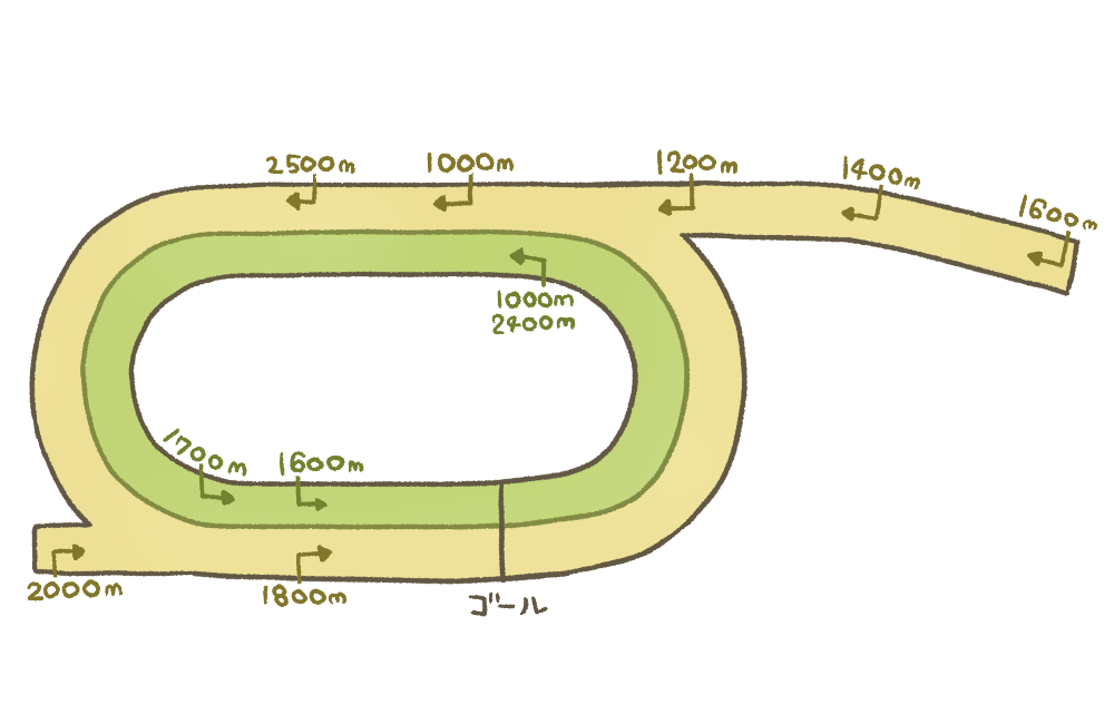 一周1600m、直線は300mと門別競馬場と同じくらいの規模を誇り、3コーナーから4コーナーにかけては緩やかに下り、直線半ばから上り坂があるなど高低差が激しいのがコースの特徴です。