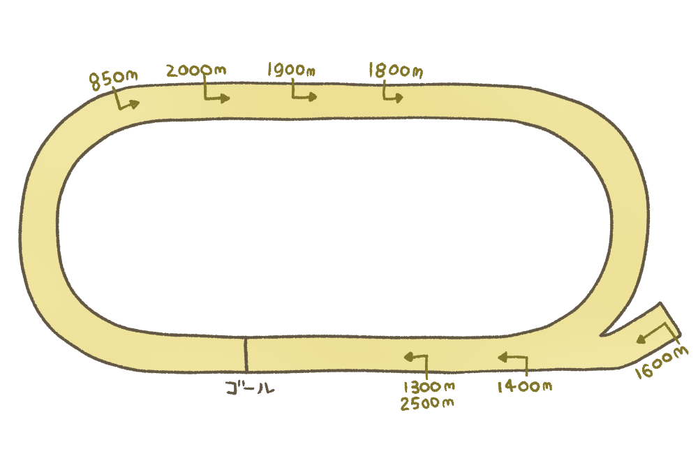 一周1200m、直線距離が245mと同じ岩手競馬の盛岡競馬場と比べると地方競馬らしい小回りコースとなっている。