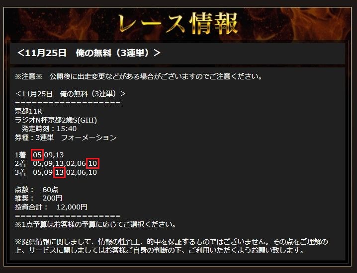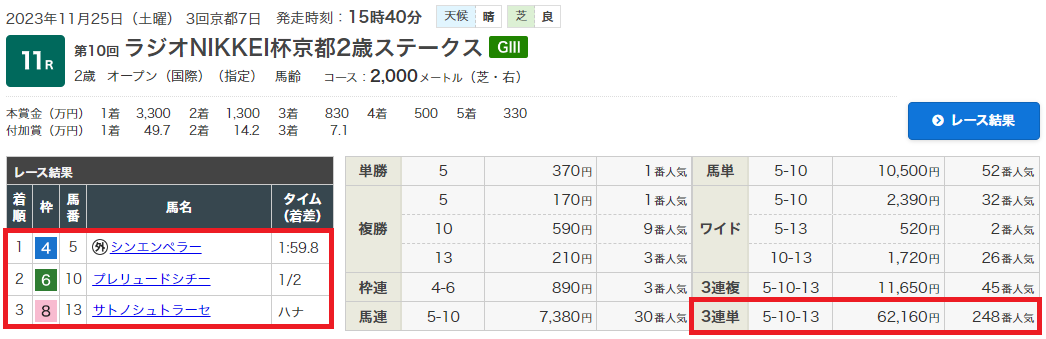 25日(土)ラジオNIKKEI杯京都2歳S(G3)で無料情報3連単621.6倍的中!