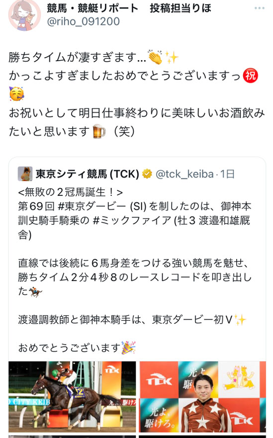部下のりほさんにもいい報告ができました。御神本ジョッキーの2冠達成初東京ダービー制覇とともにダブルでいい報告になりましたね(笑)