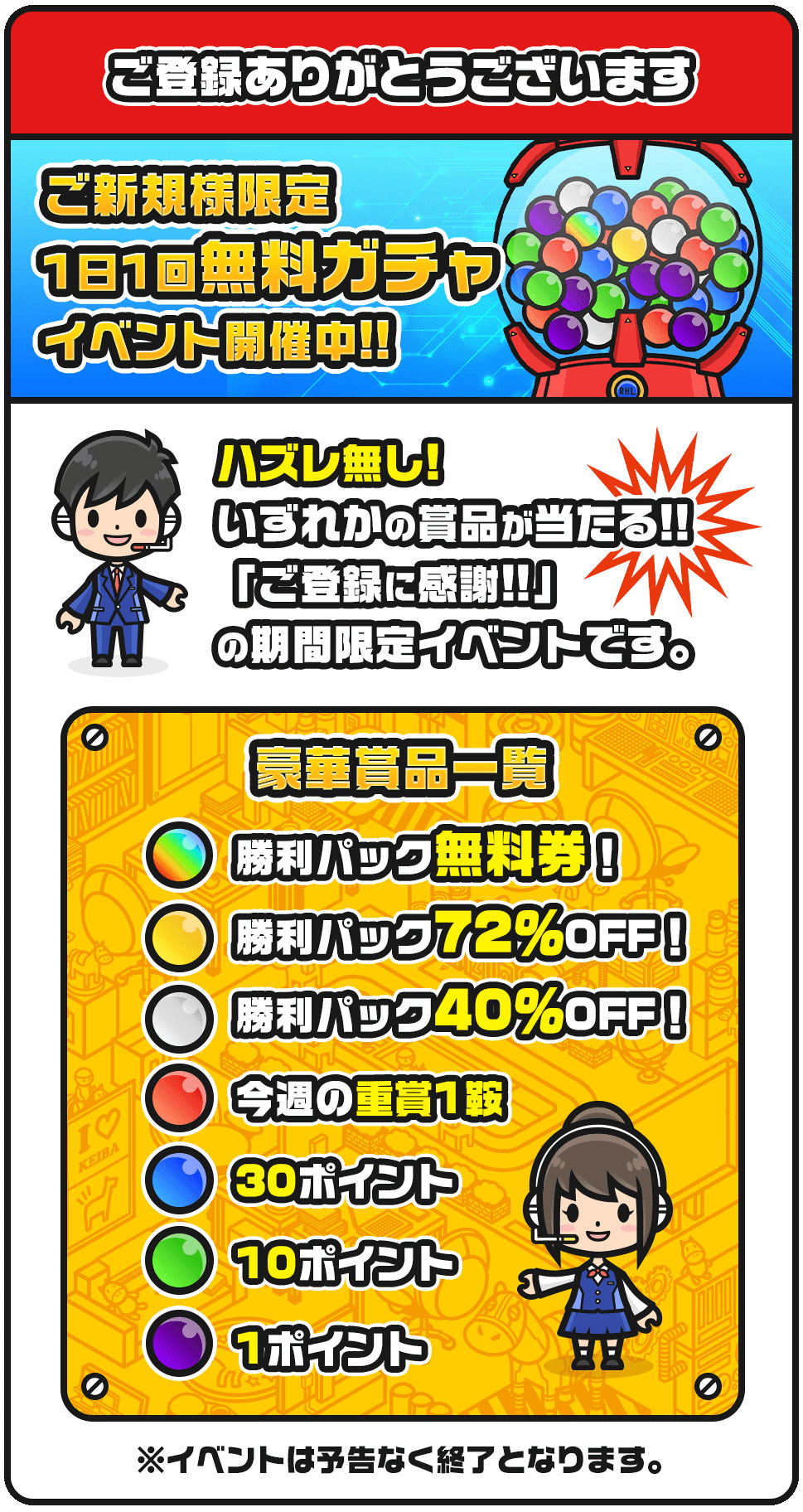 登録すると1週間限定でご登録記念のイベントとして「無料ガチャ」が回せるようでさっそく回してみたら緑色の10ポイントが当たりました。