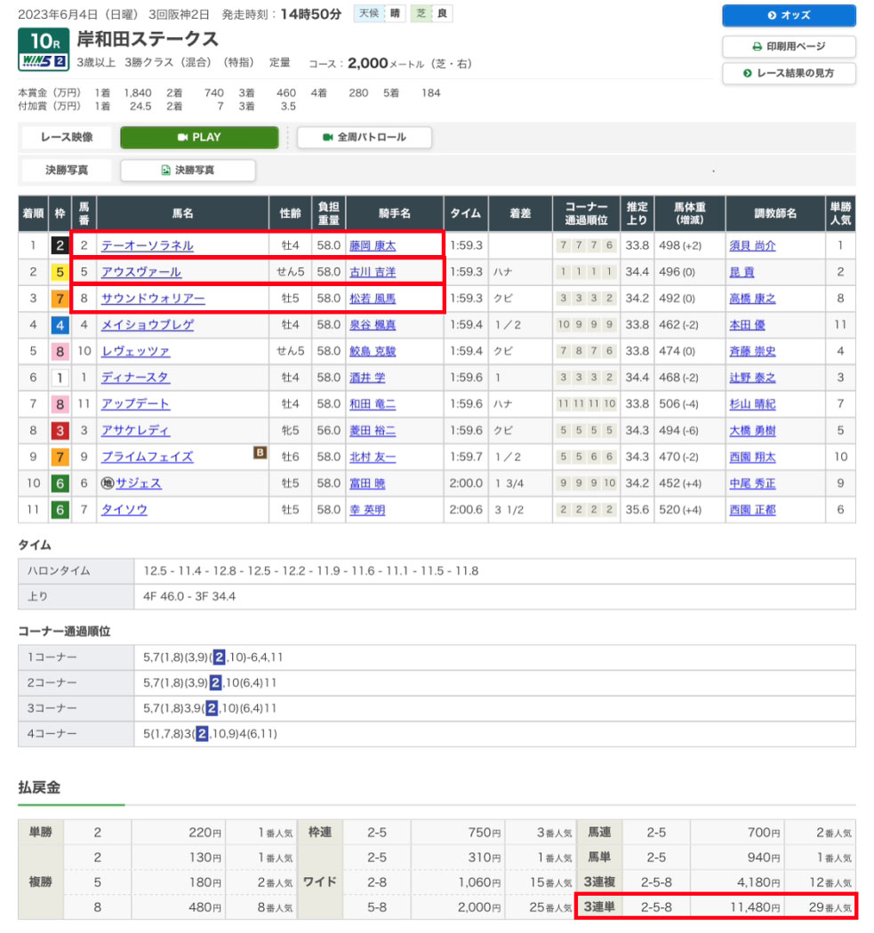 接戦でしたが1着固定の1番人気②テーオーソラネルが勝利し、紐に人気薄で3着まで来てくれた⑧サウンドウォリアーを入れていたので上手いこと馬券を当てることができました。