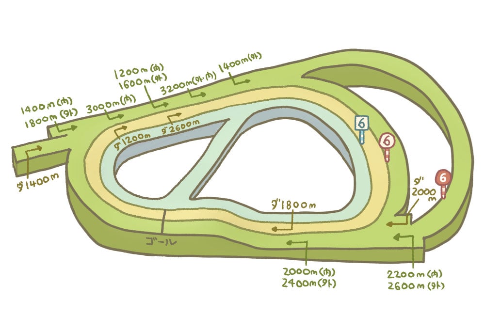 開催されない期間が短く、芝の育成がやや不十分となり、雨開催などでの馬場悪化が激しく、開催が進むにつれパワーが要求される。