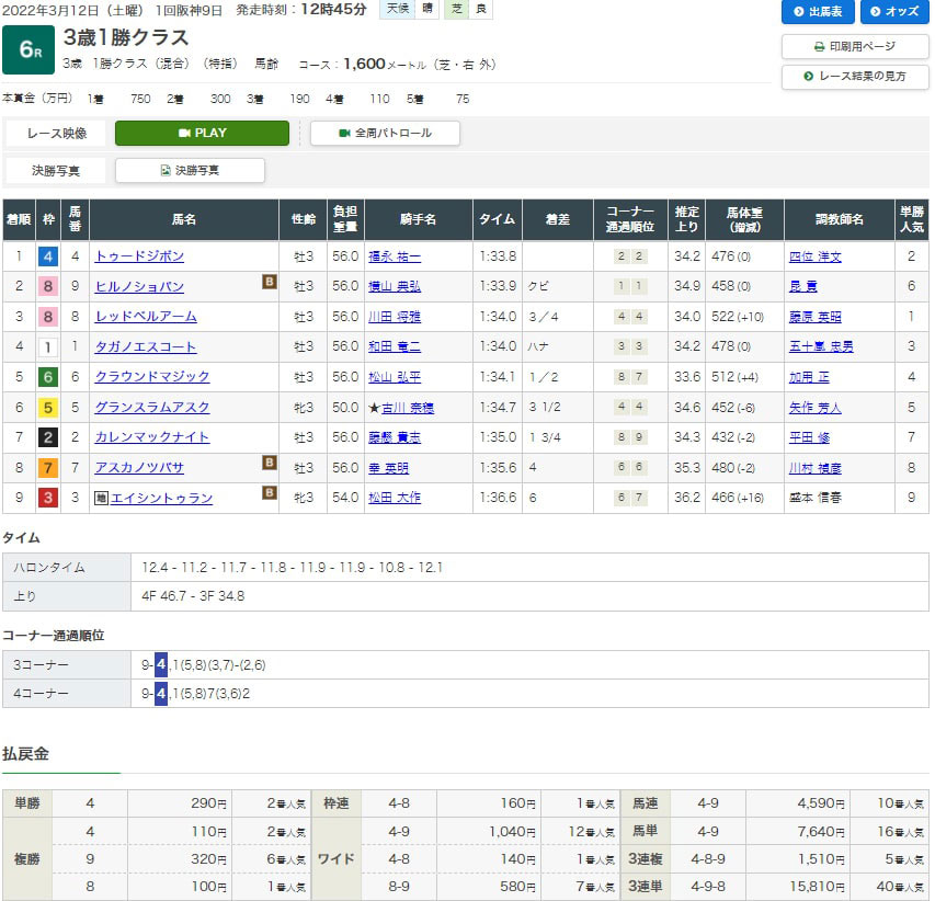 【検証レース:3/12 阪神6R 3歳1勝クラス】