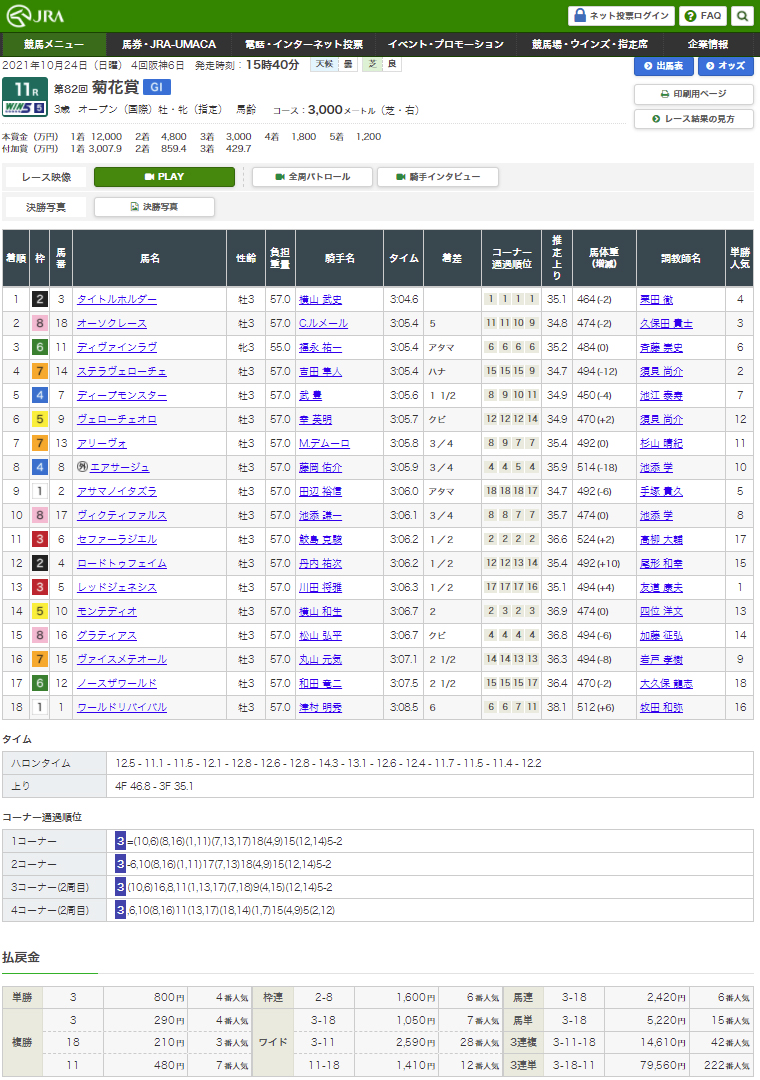 話がそれてしまいましたが菊のタイトルを手にしたのは逃げたタイトルホルダー、2着オーソクレース、3着はなんと牝馬のディヴァインラヴ。