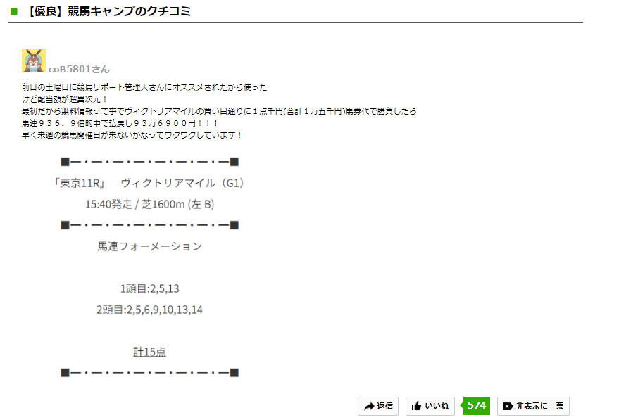 もしどこかクラシック2冠目の予想ご登録を迷われている方がいらっしゃれば、あの大荒れのヴィクトリアマイルを当てていた【競馬キャンプ】というサイトをオススメしたいと思います。