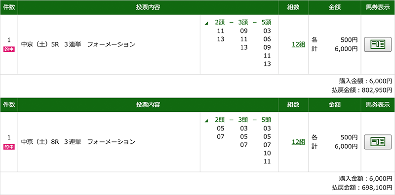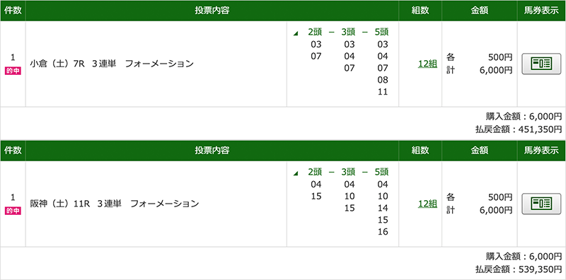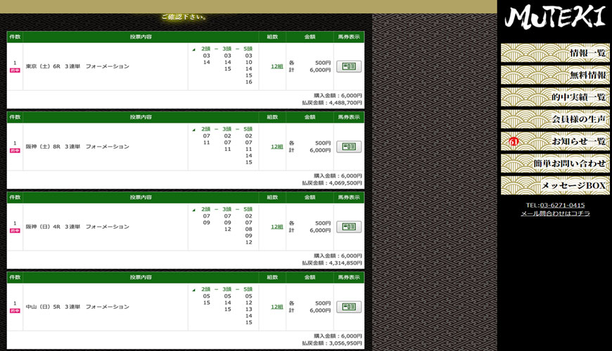 難しい予想は競馬のプロに全任せで、全乗っかりするだけで毎週これくらいの的中がもらえます。 ムテキの予想は一番信用しているし毎回期待以上の的中をもらえています。