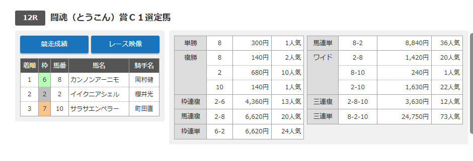 これが川崎12の結果です! 3連単も2万馬券当たってる買い目だったね!